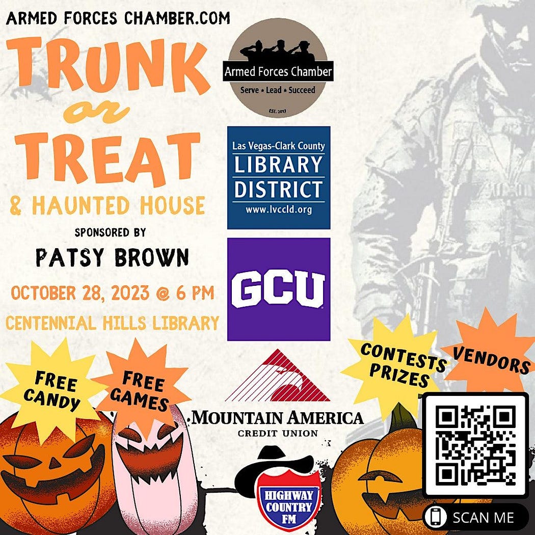 Prepare for a Halloween celebration with a patriotic twist at the Armed Forces Chamber 2023 Trunk or Treat & Haunted House on October 31st. This event, held at the iconic Centennial Hills Library, assures a thrilling evening of family-friendly fun, spine-tingling scares, and a heartfelt tribute to our armed forces.