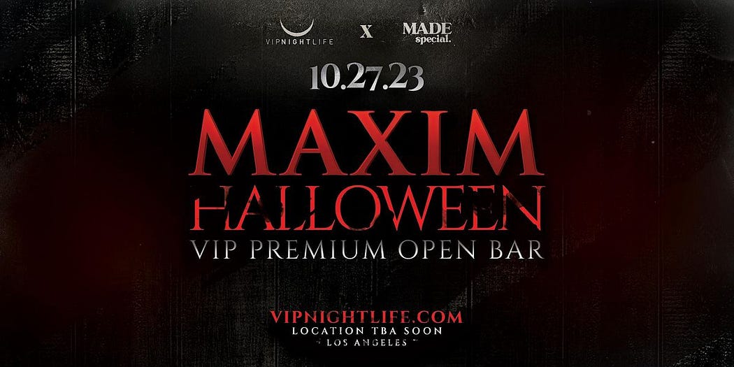 The biggest & sexiest Halloween party of the year will be on October 27th 2023 in Los Angeles. MAXIM Halloween 2023 — there isn’t another Halloween party like it! This Costume party must be attended with Halloween Costume or Formal Attire with Mask.